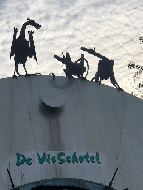 Bij een bezoek aan De Visschotel in Joure valt de winkel direct op. Dit pand, ook wel bekend als het kunstwerk ‘Crash 1998’, is een herkenningspunt in het centrum van Joure. ‘Crash 1998’, ontworpen door het kunstcollectief Van der Berg, combineert futuristische en prehistorische elementen. Het ontwerp, dat doet denken aan een vliegende schotel of een gebarsten ei, symboliseert zowel de toekomst als het verleden. De prehistorische figuren op de dakrand versterken deze dualiteit en nodigen uit tot nadenken over de ontwikkeling van technologie en natuur.